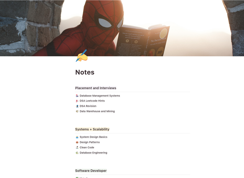 Transform the way you learn and build with this power-packed Notion template—crafted to cover every aspect of software engineering, from the foundations to advanced topics. Whether you’re prepping for interviews, building real-world applications, or aiming to master your craft, this template is your complete knowledge companion!