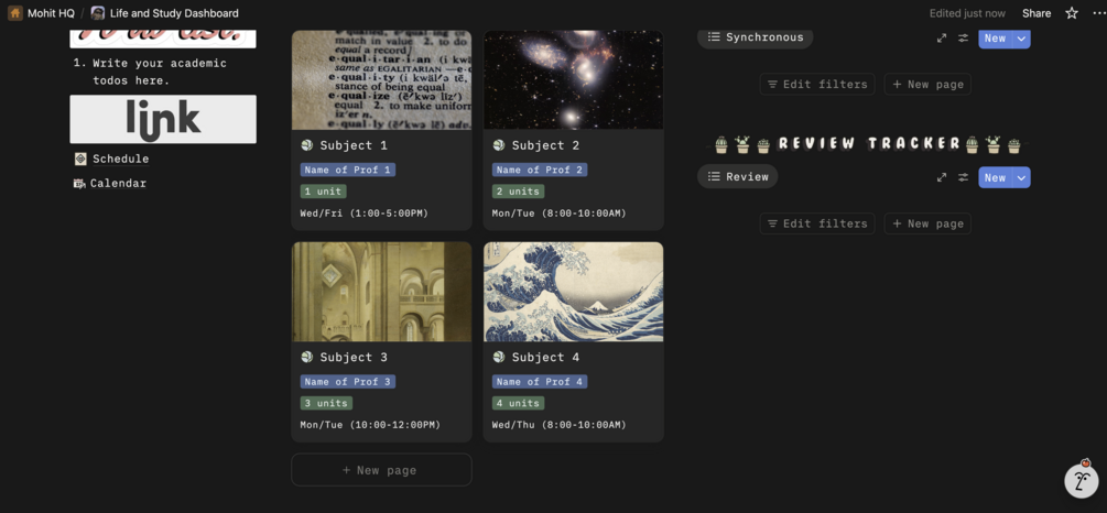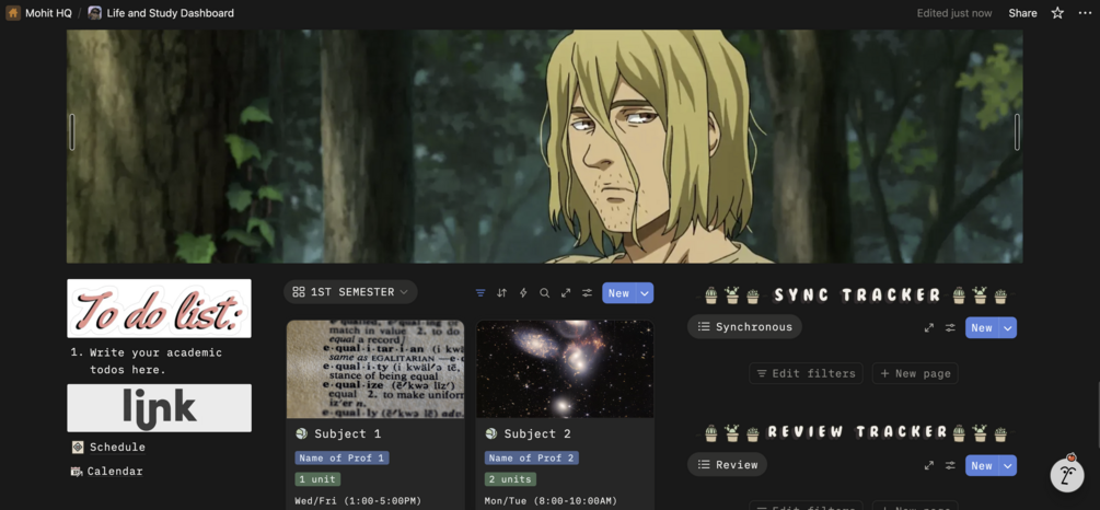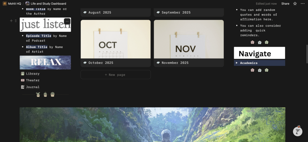 The Life + Study Dashboard is a complete Notion workspace designed to help you manage academics, personal life, and media in one organised system. It brings together planning, tracking, studying, journaling, and documentation—without clutter or complexity.